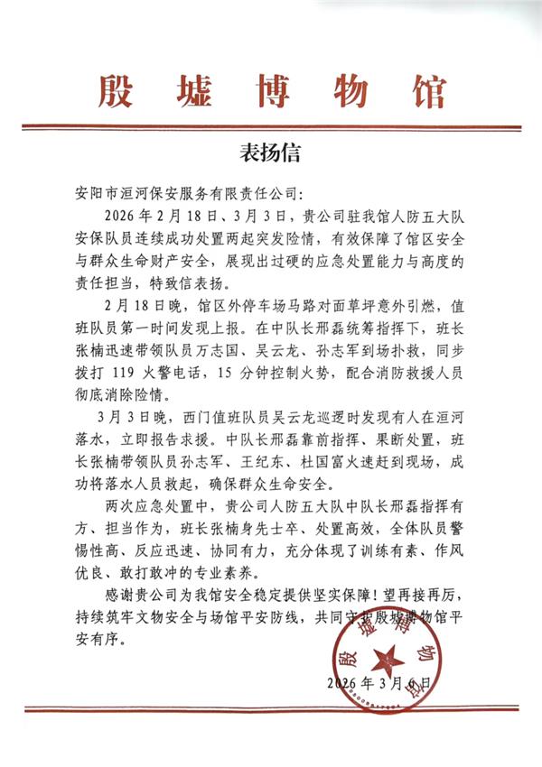 此次表揚信,既是對人防五大隊應急處置工作的認可,更是對洹河保安整體服務水平的肯定。下一步,大隊將以此為動力,持續(xù)強化隊伍應急能力建設,筑牢文物安全與場館平安防線,為守護殷墟博物館平安有序運行、保障人民群眾生命財產(chǎn)安全貢獻更大力量。